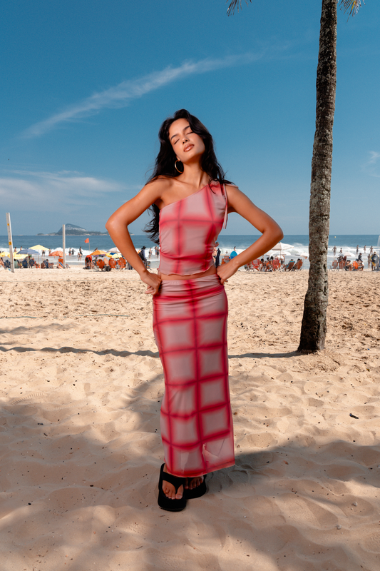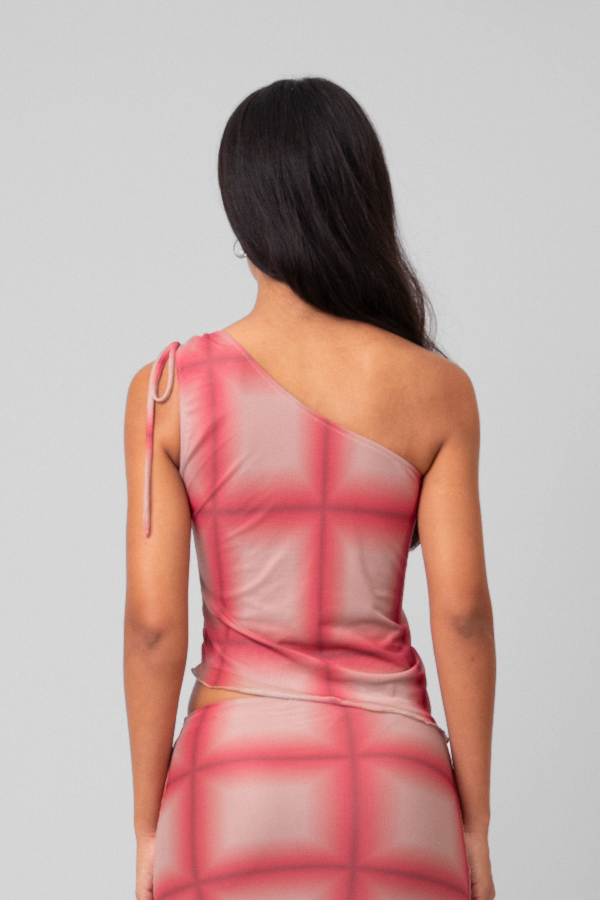 Blusa assimétrica de tule forrado com modelagem de um ombro só. Possui detalhe franzido com amarração que regula largura do ombro.