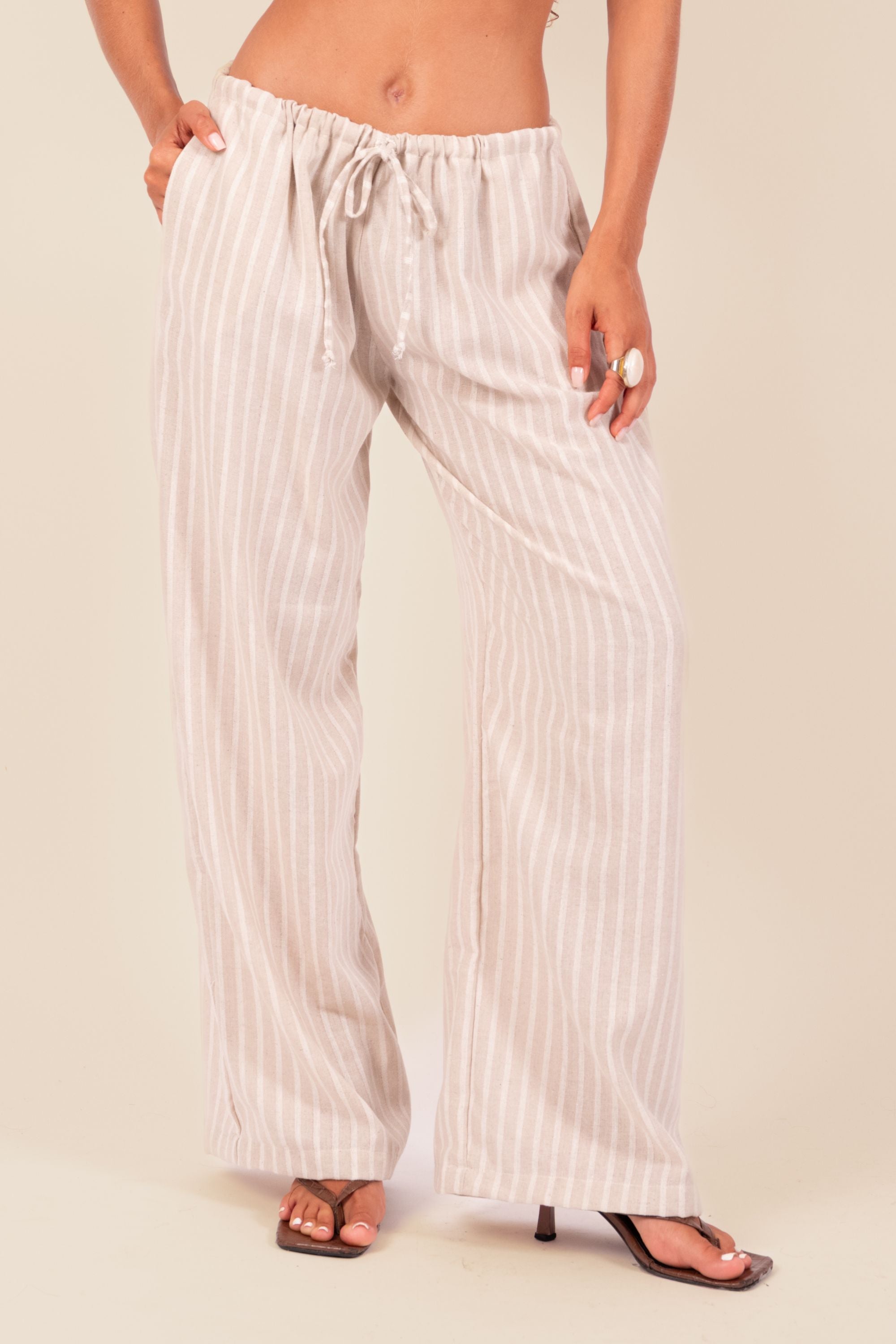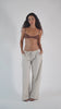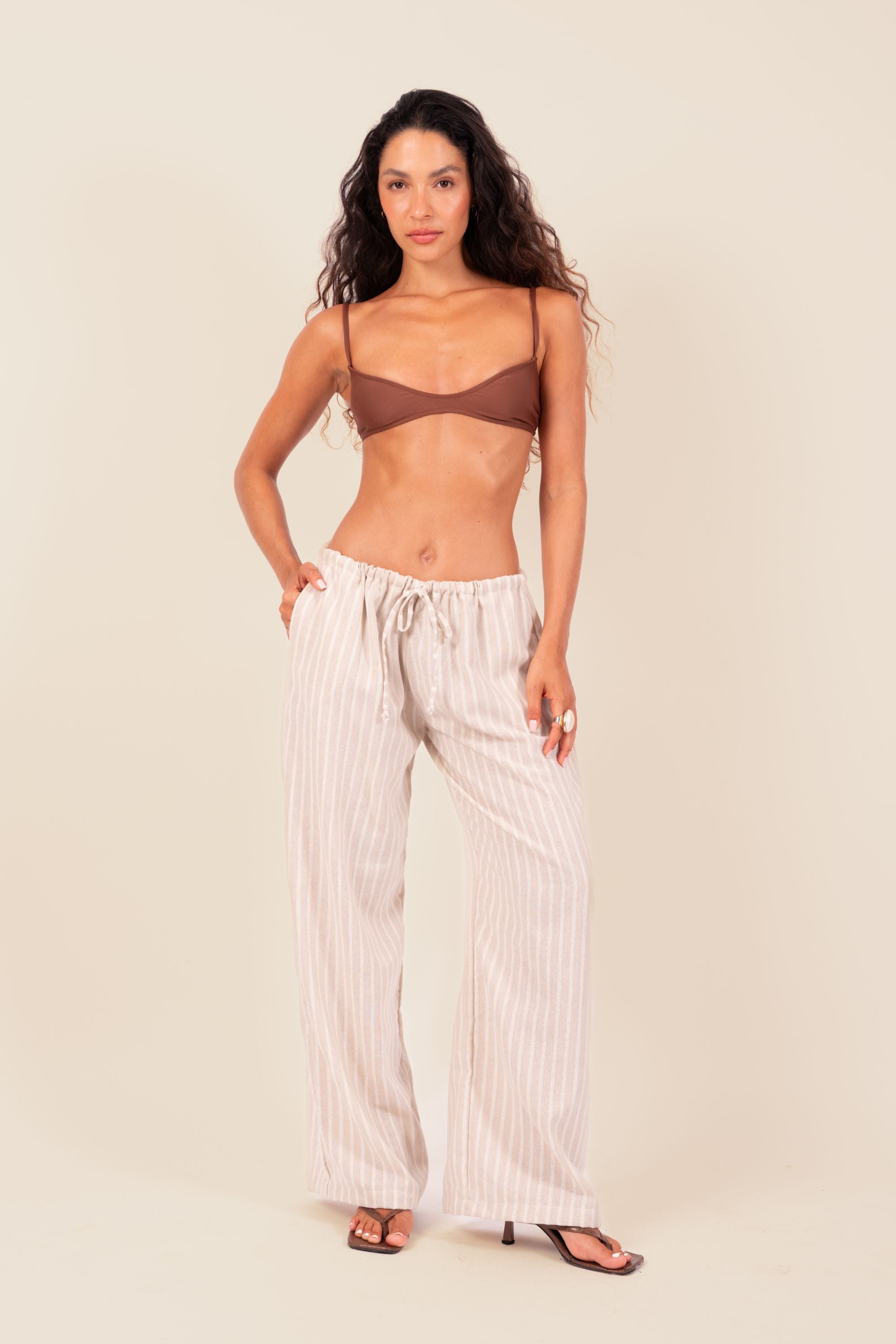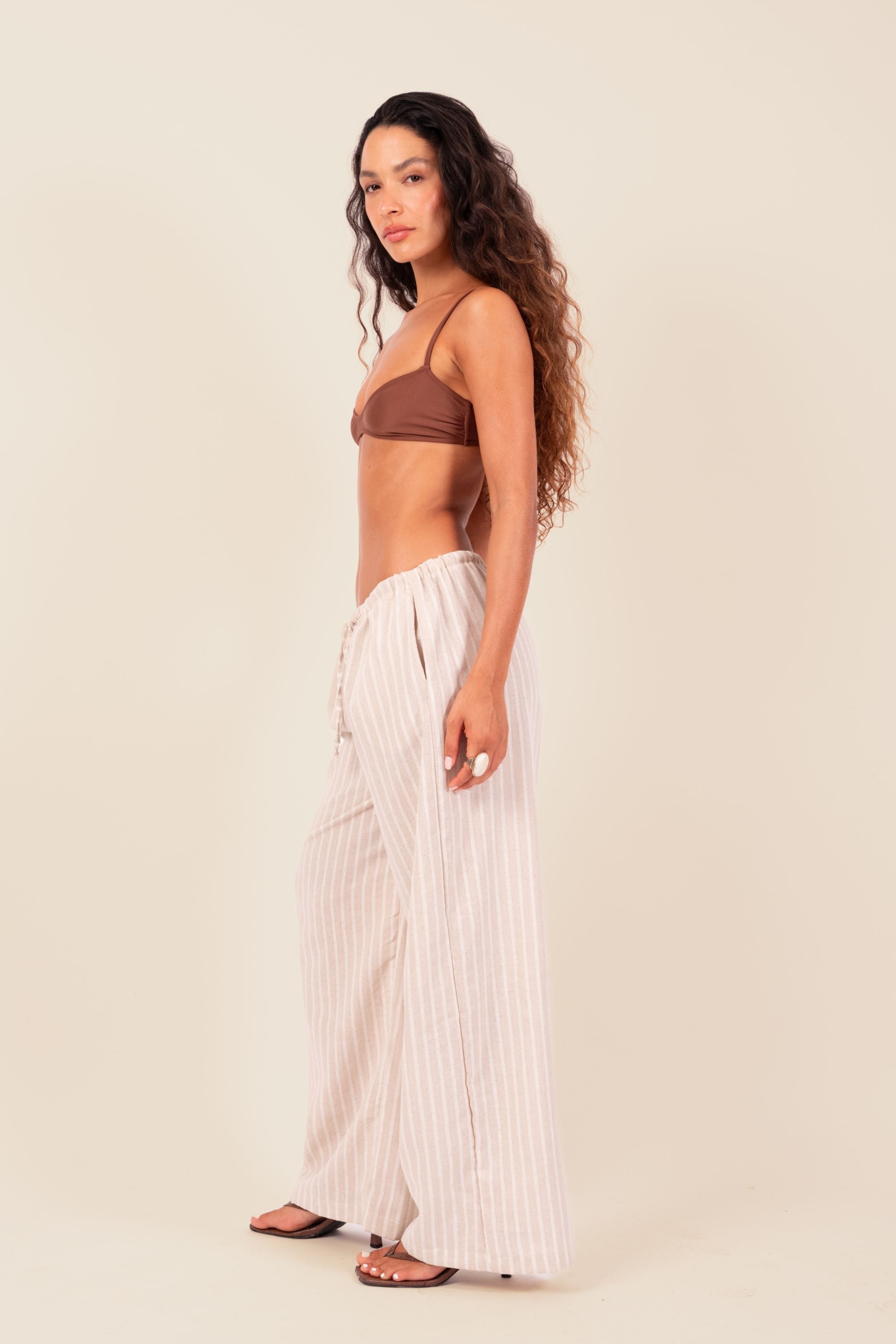 Calça com modelagem ampla e tecido leve e natural. Pode ser usada como cintura alta ou baixa, amarração na cintura e bolsos laterais.