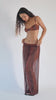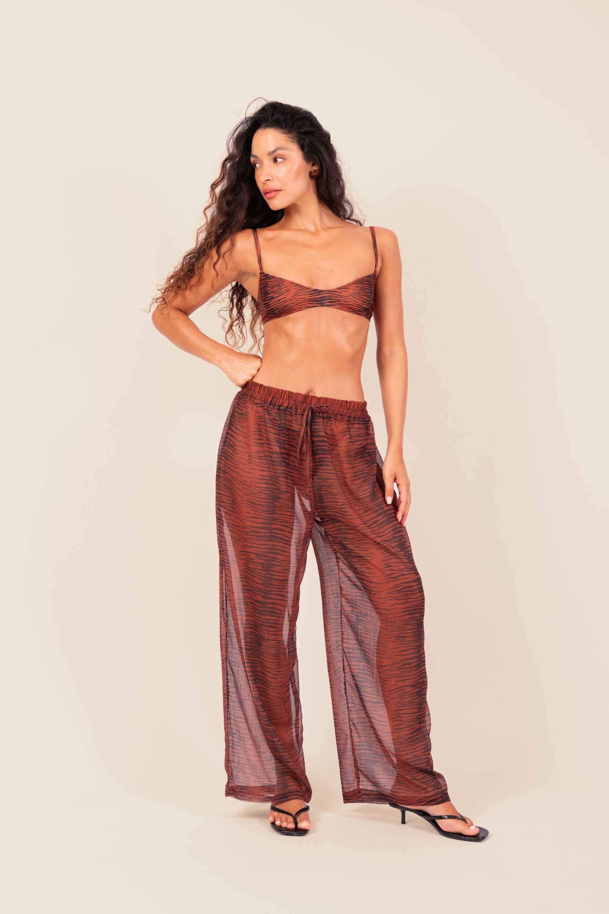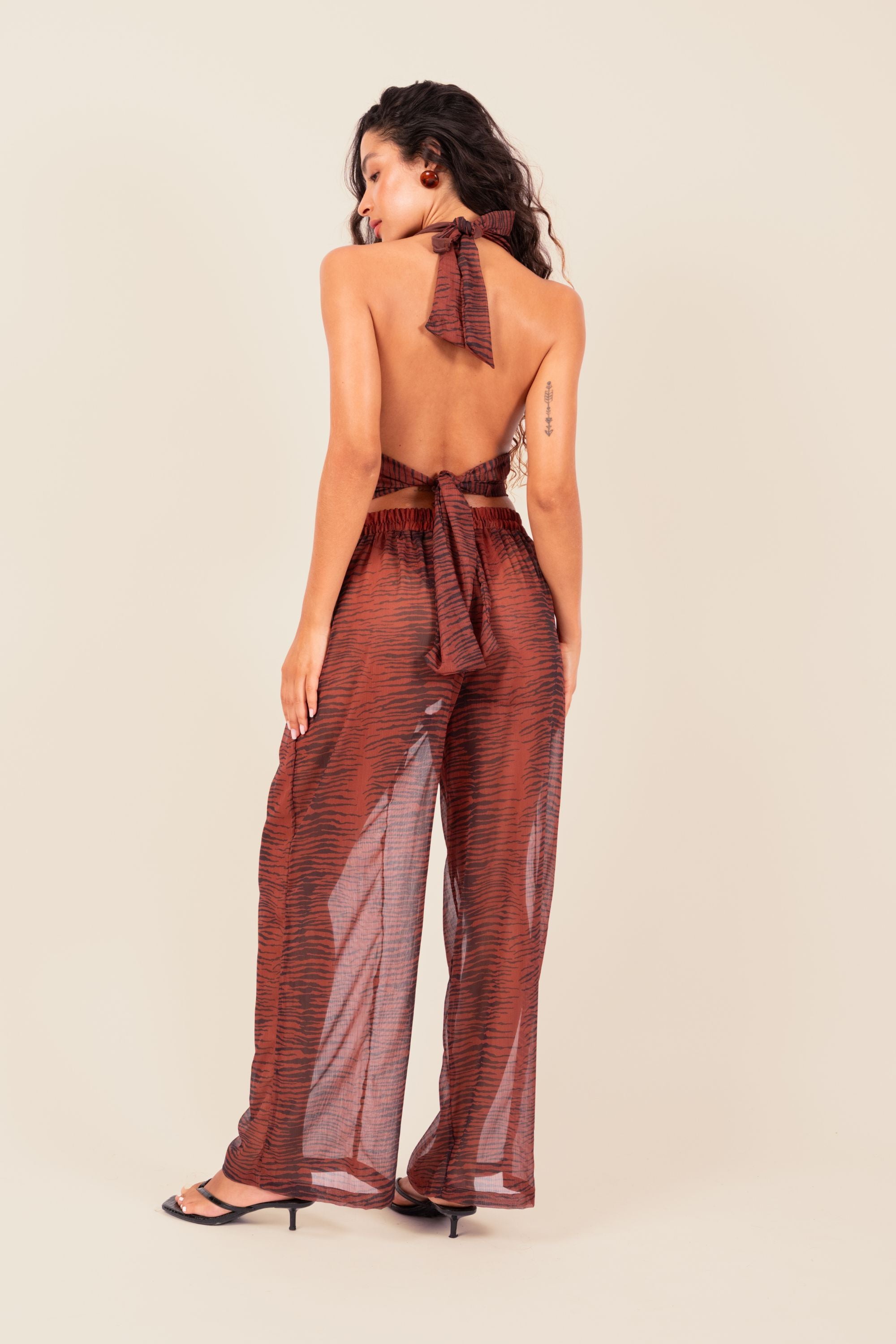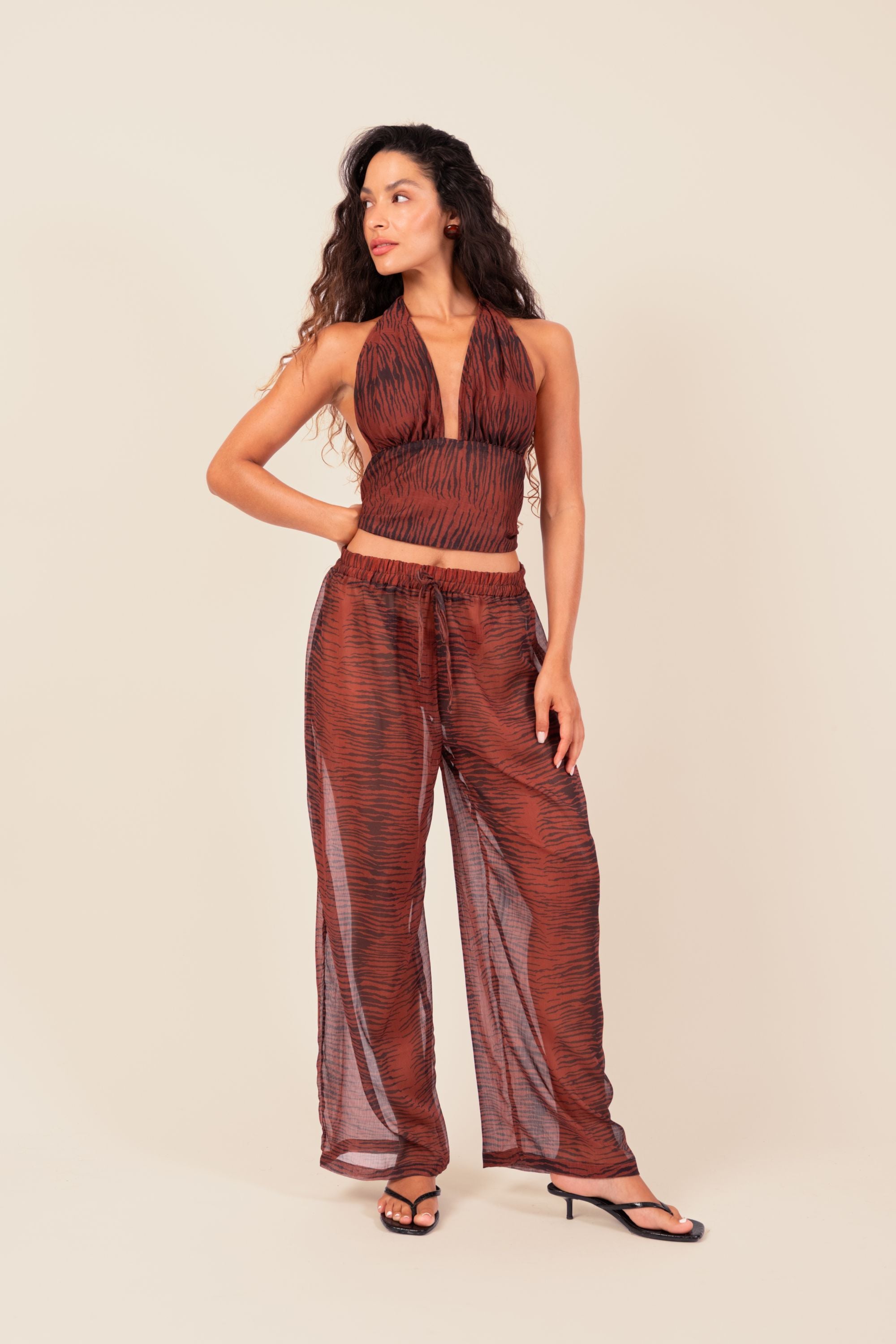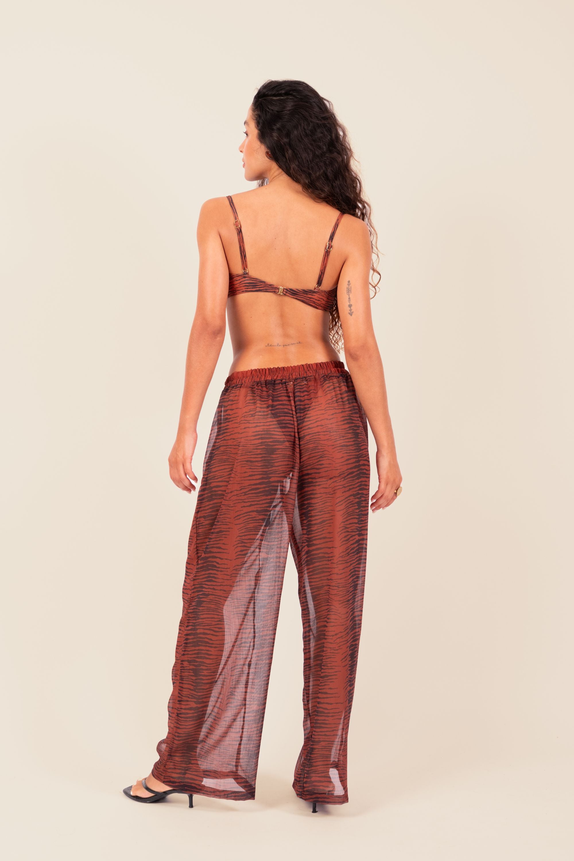 Calça de crepe levemente transparente. Possui cintura alta, modelagem ampla e cós com elástico.