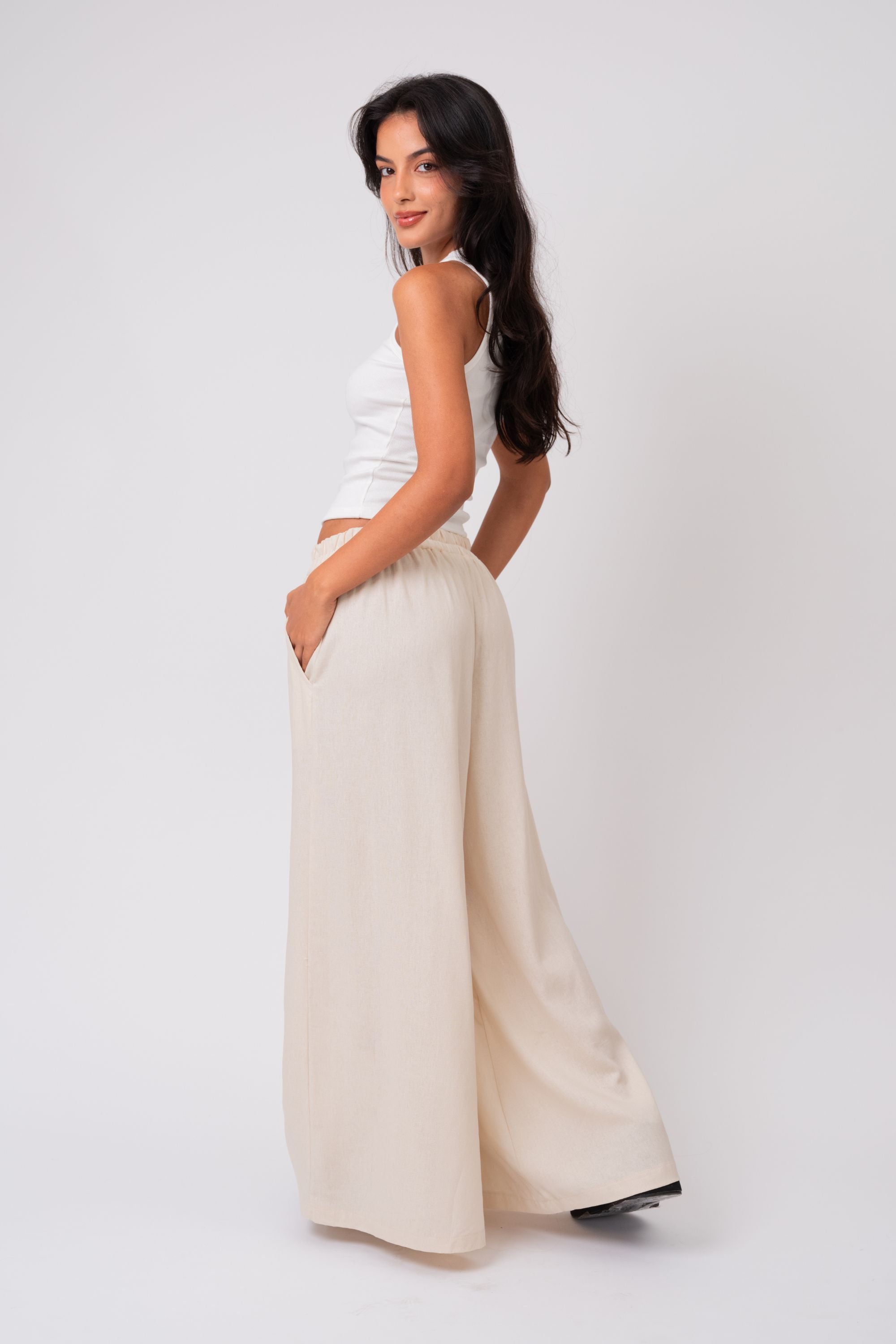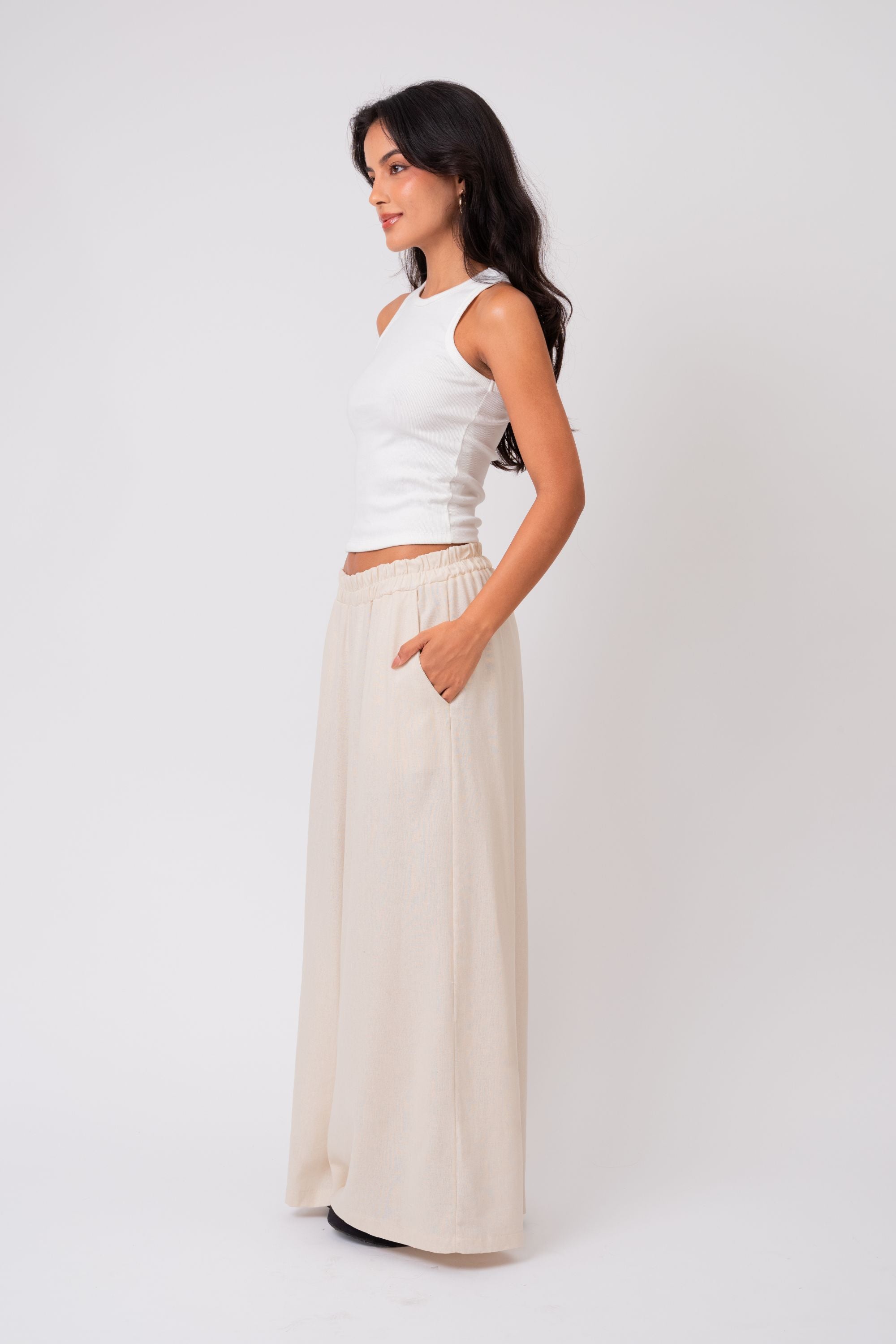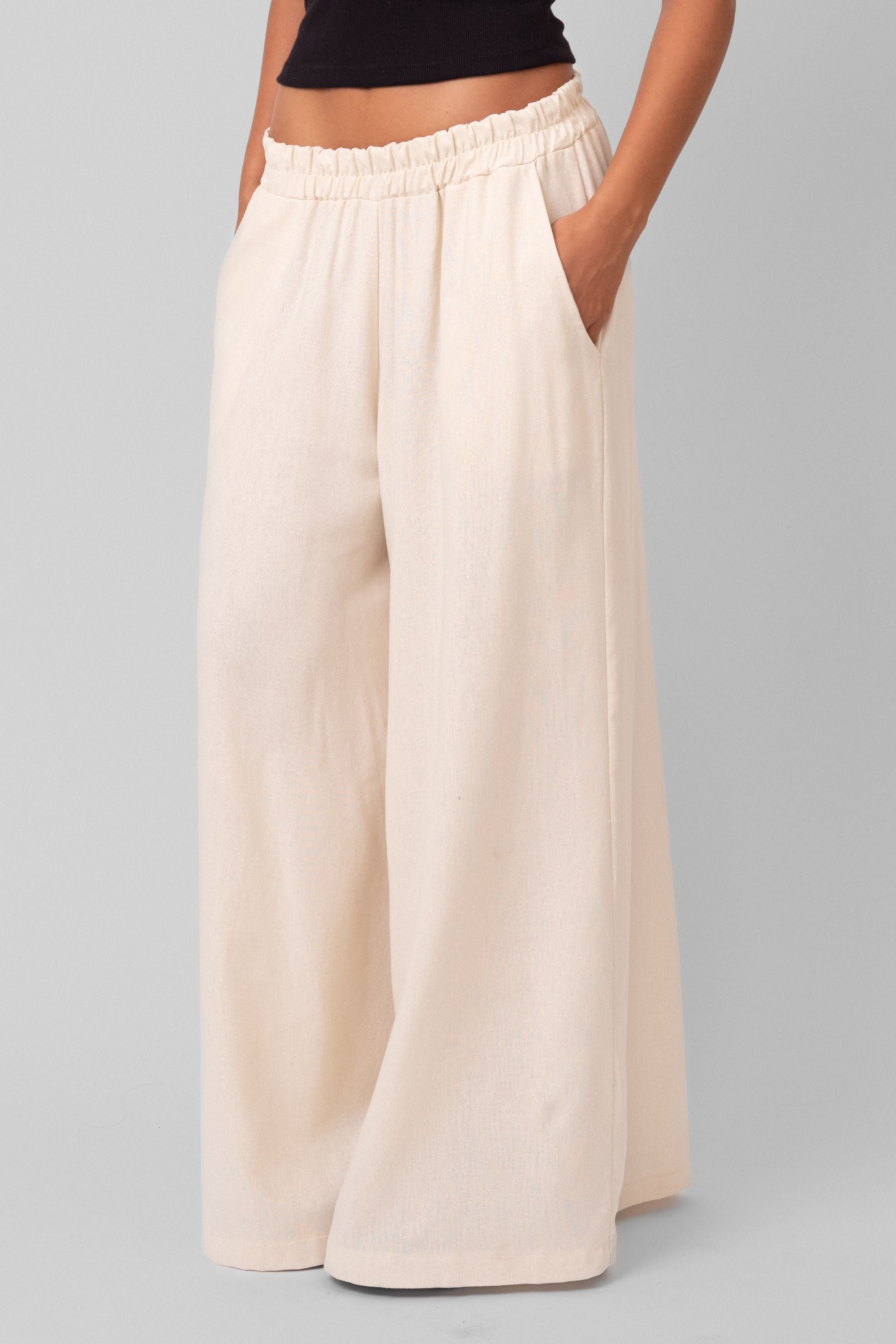 Calça fluida estilo pantalona com elástico na cintura e bolsos laterais.