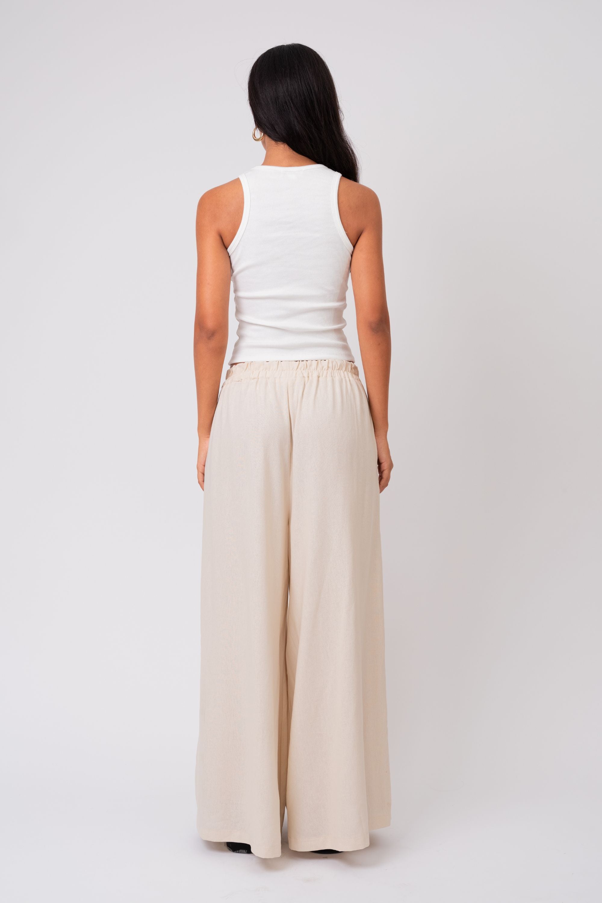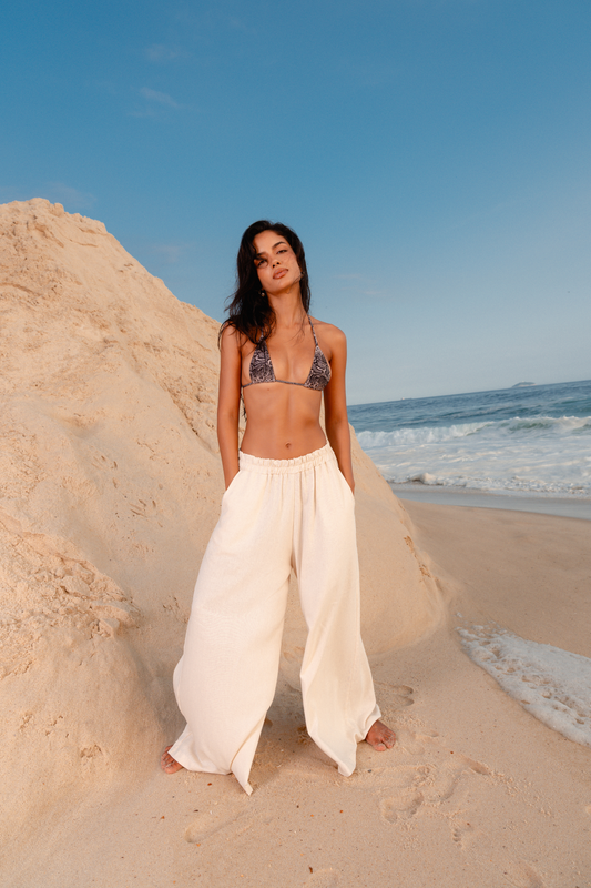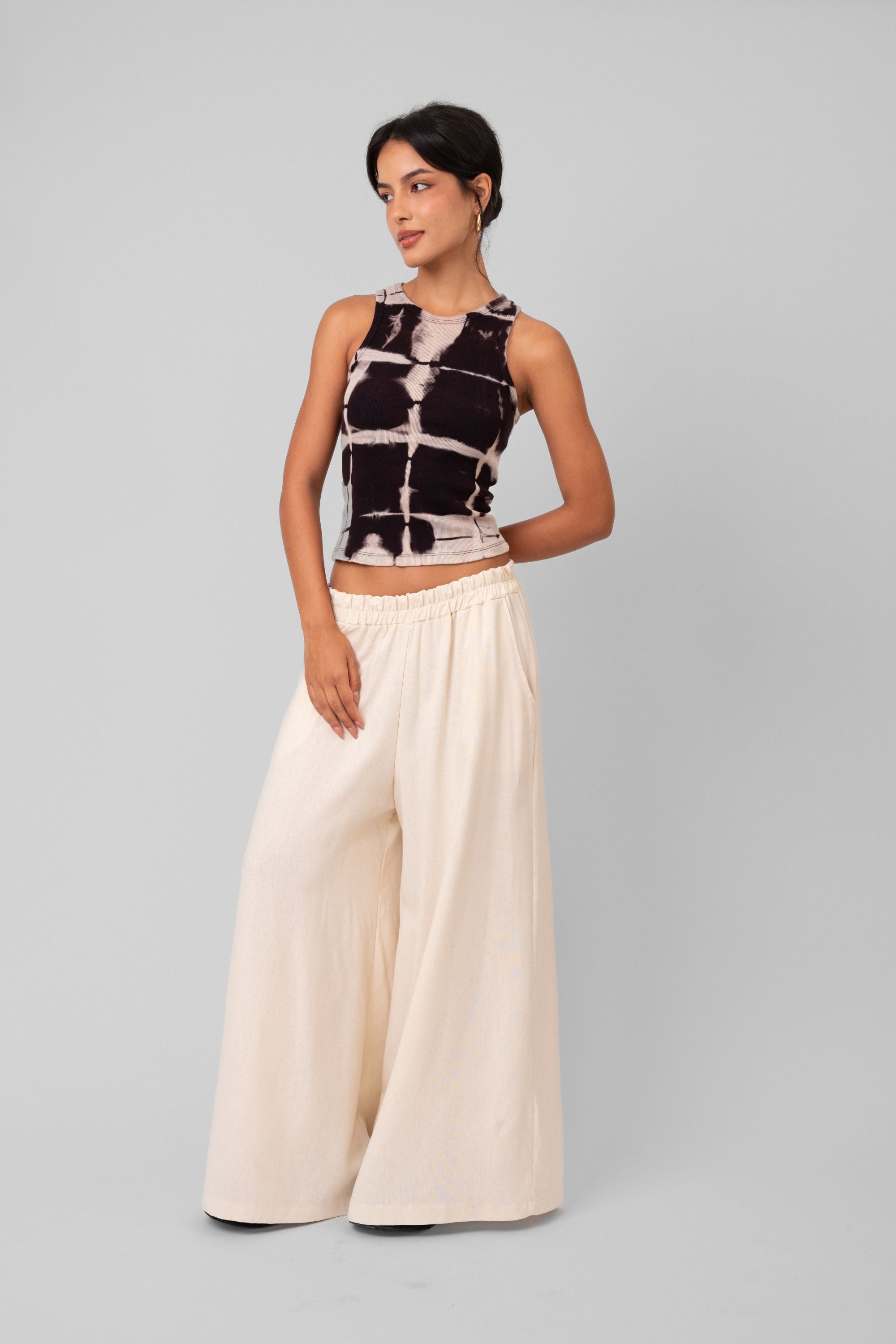 Calça fluida estilo pantalona com elástico na cintura e bolsos laterais.