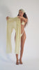 Calça com cós elástico em malha vazada. Pode ser usada como cintura baixa e alta.