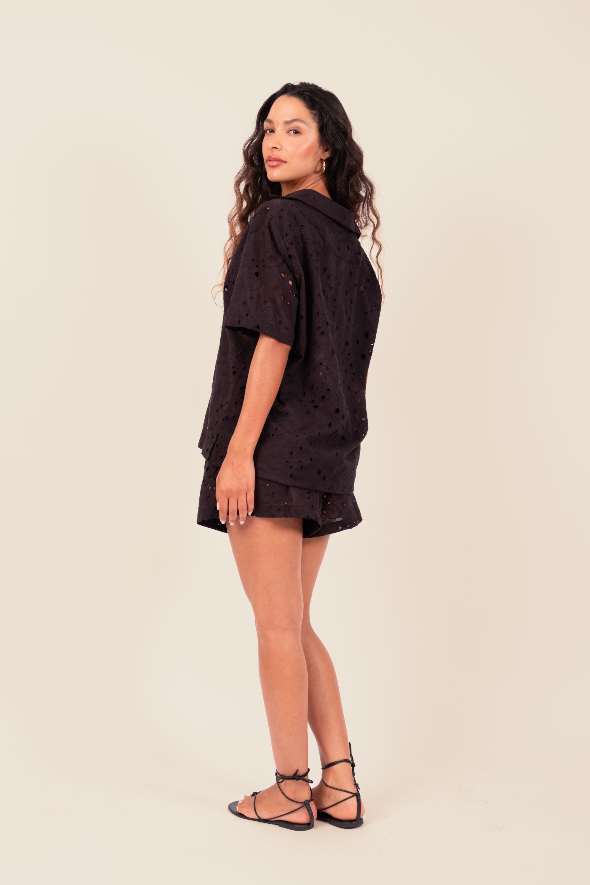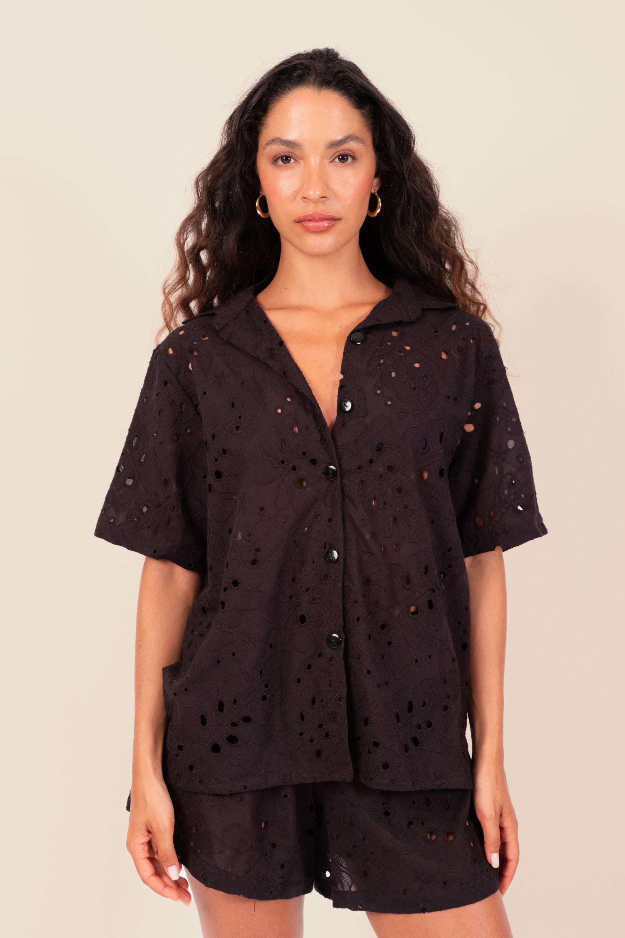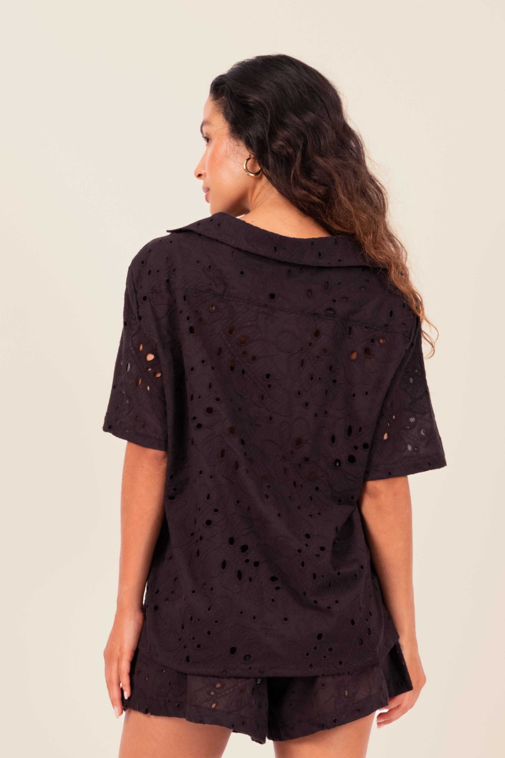Camisa de laise, tecido de algodão leve com bordados. Possui abotoamento frontal e mangas curtas.