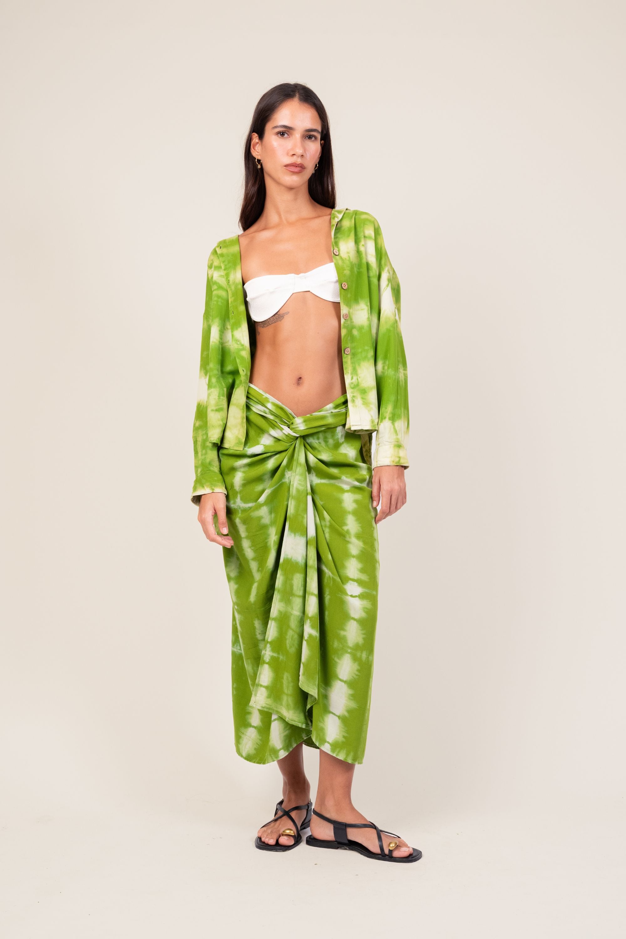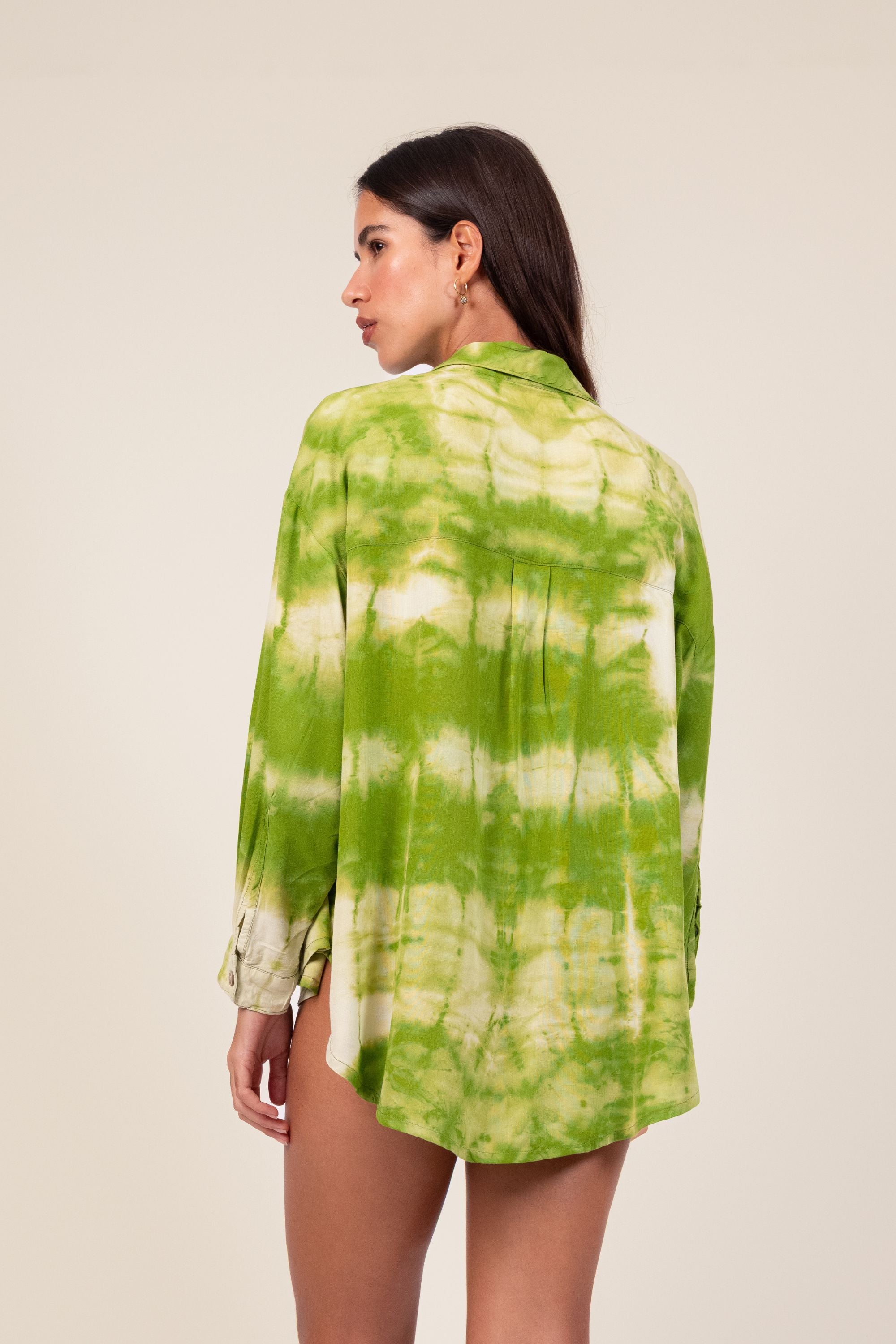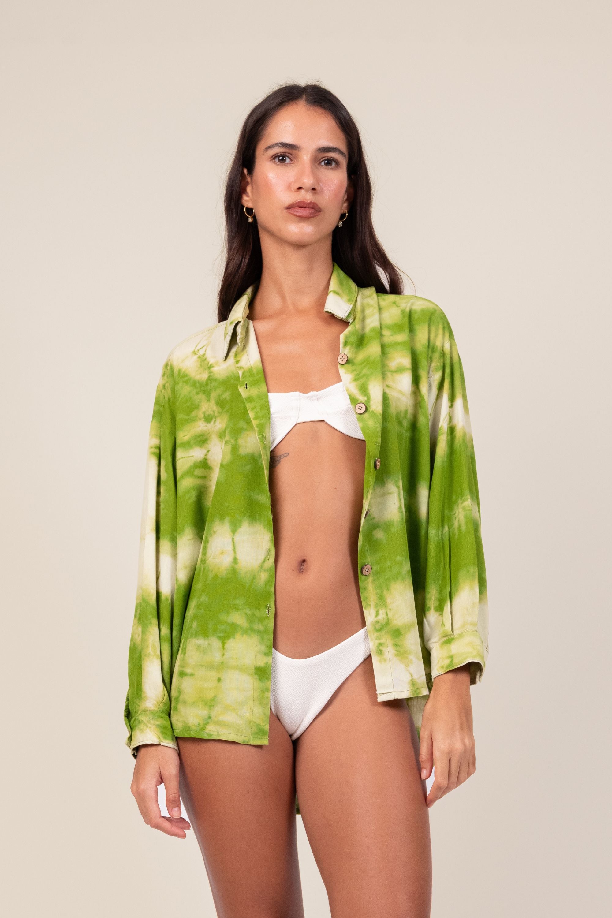 Chemise de viscose com modelagem mais curta na frente e maior atrás. Possui abotoamento frontal e tingimento artesanal.