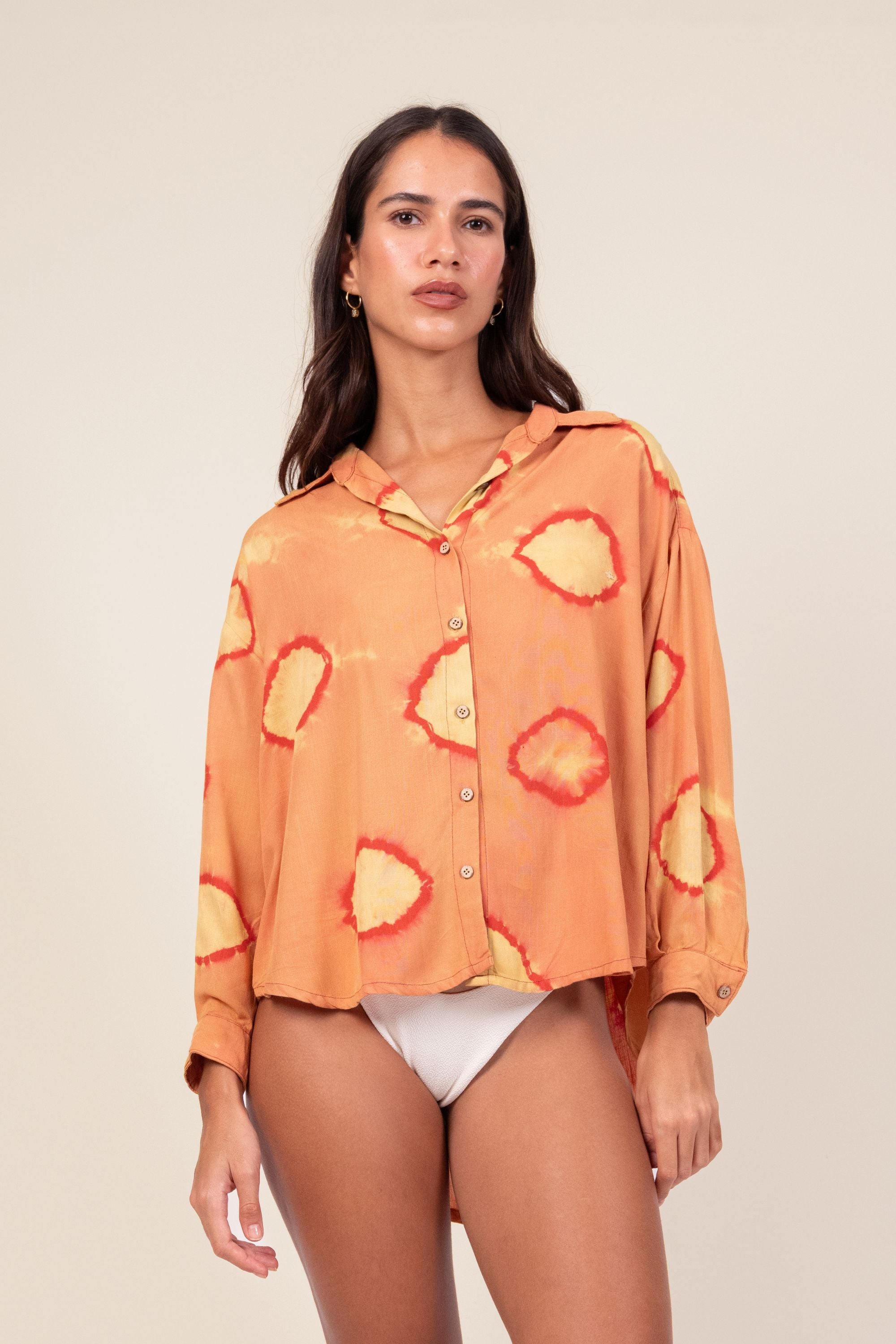 Chemise de viscose com modelagem mais curta na frente e maior atrás. Possui abotoamento frontal e tingimento artesanal.