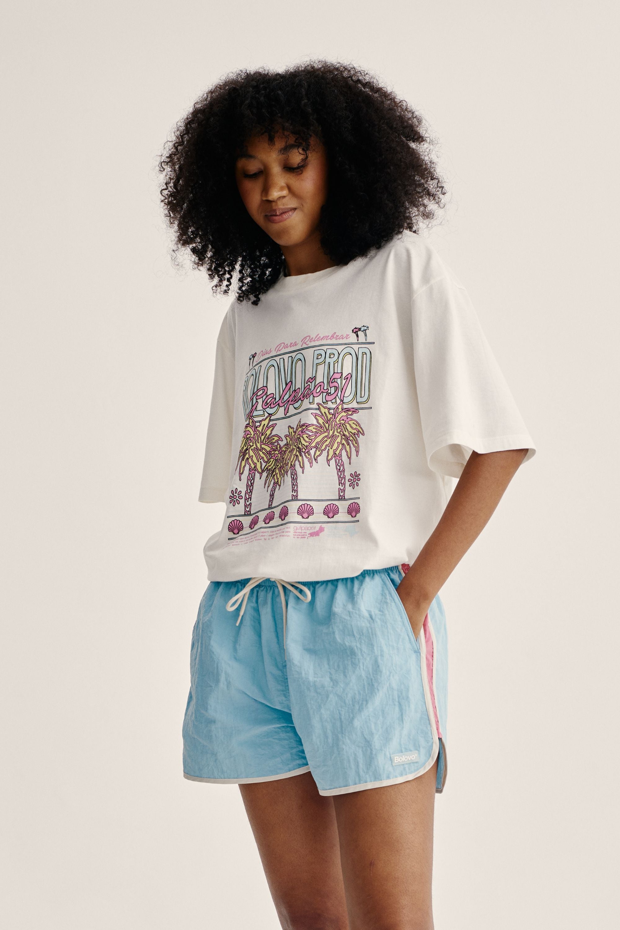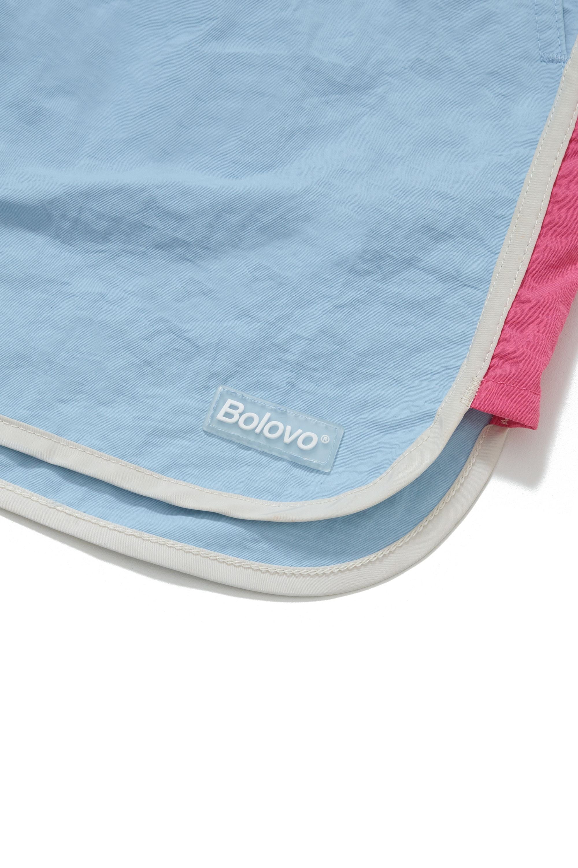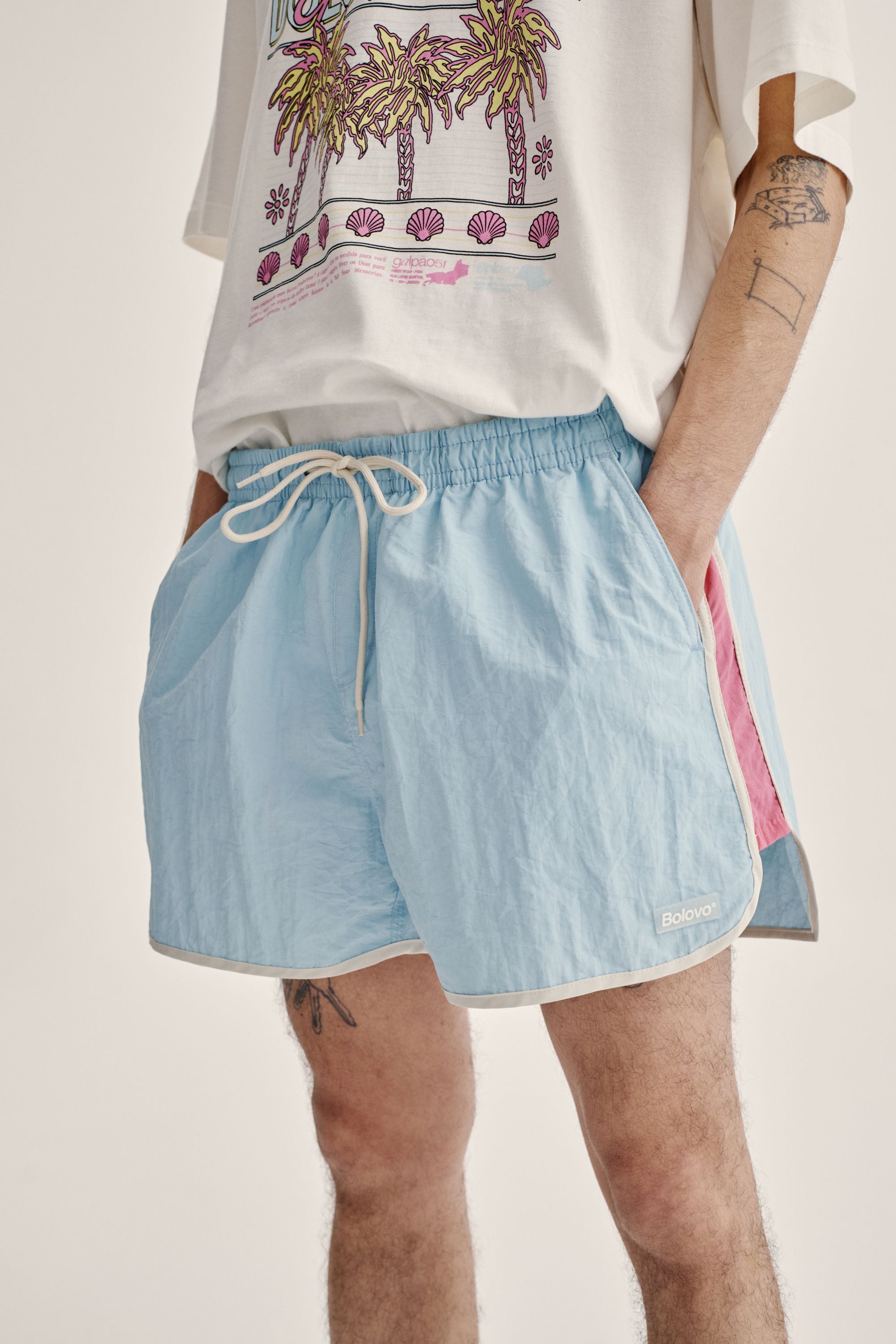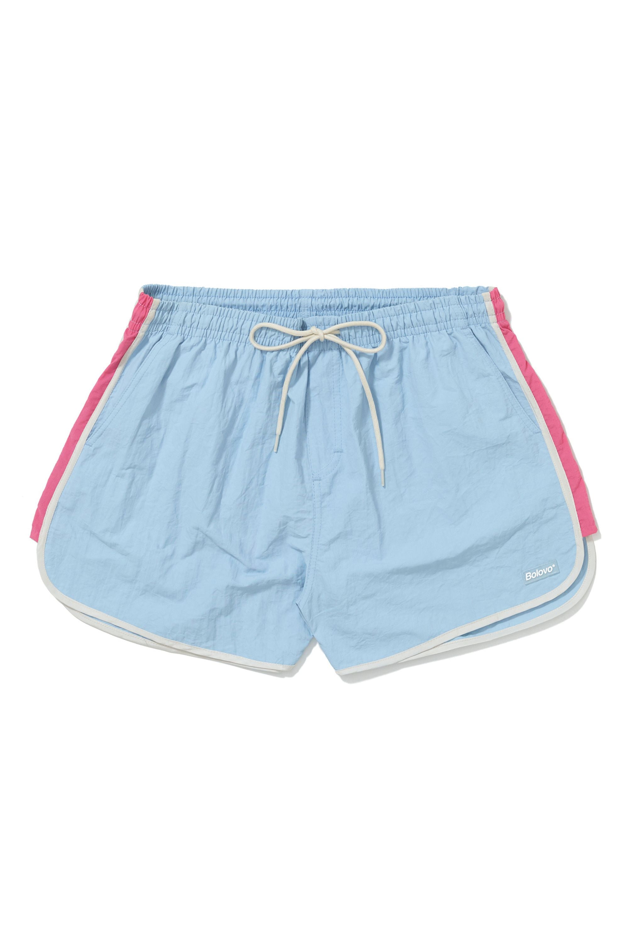 Shorts curto de tactel azul com cordão para ajuste e recortes laterais em rosa. Acabamento em viés off white com bolsos faca laterais, bolso embutido traseiro com fechamento em velcro, estampa em silk off white na parte traseira do shorts e etiqueta emborrachada aplicada na frente.
