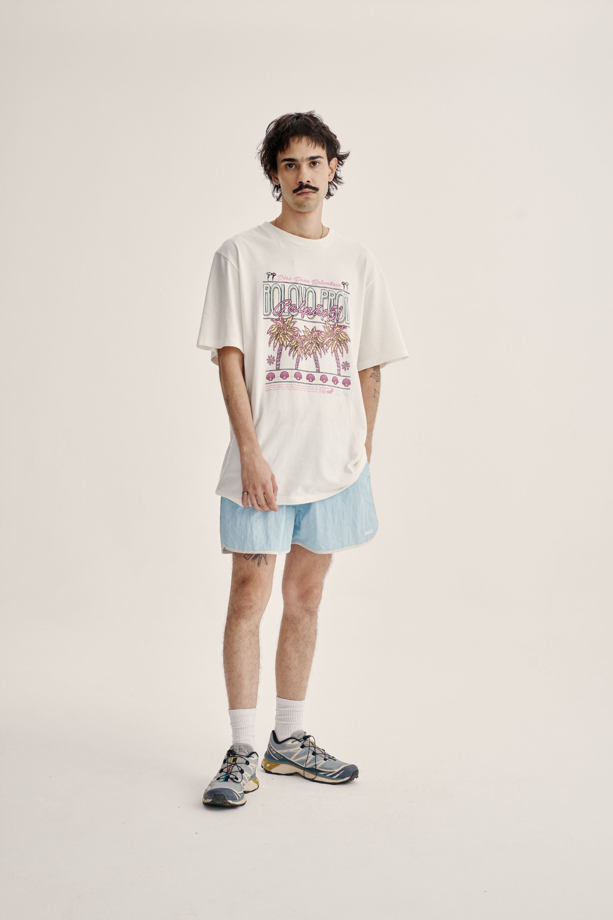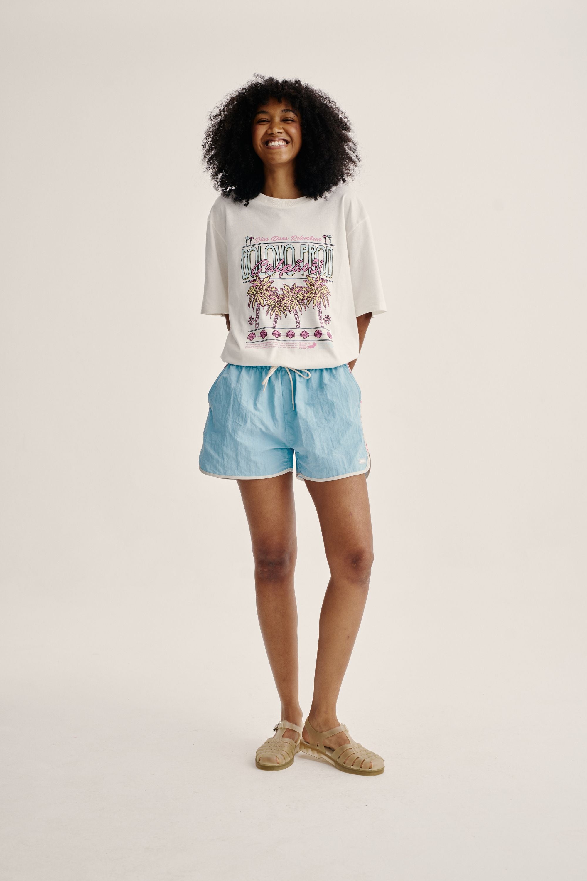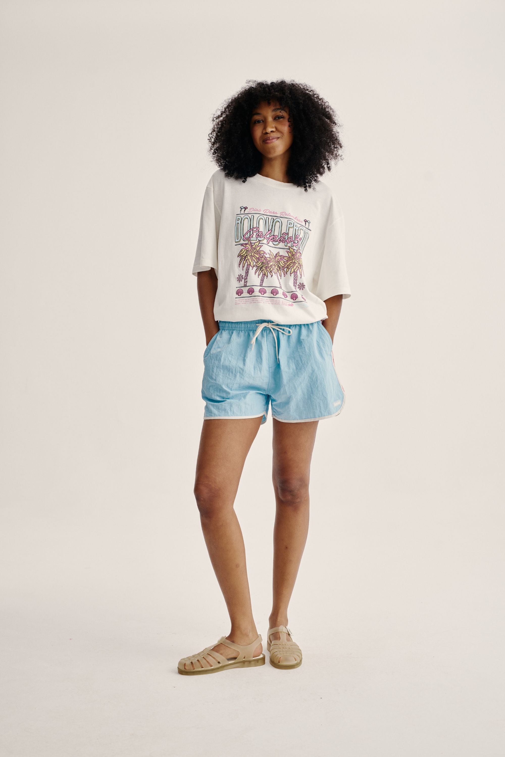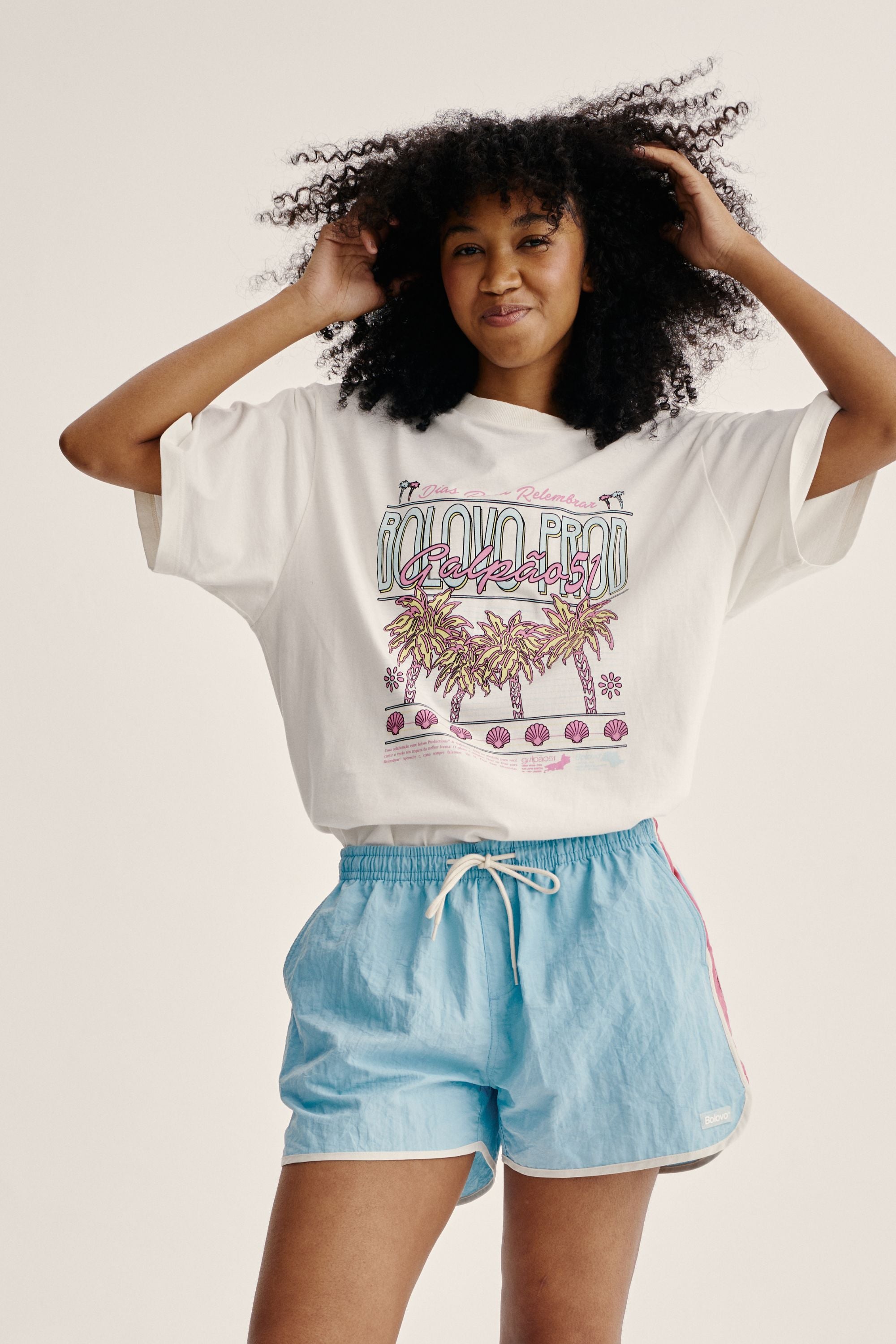 Shorts curto de tactel azul com cordão para ajuste e recortes laterais em rosa. Acabamento em viés off white com bolsos faca laterais, bolso embutido traseiro com fechamento em velcro, estampa em silk off white na parte traseira do shorts e etiqueta emborrachada aplicada na frente.
