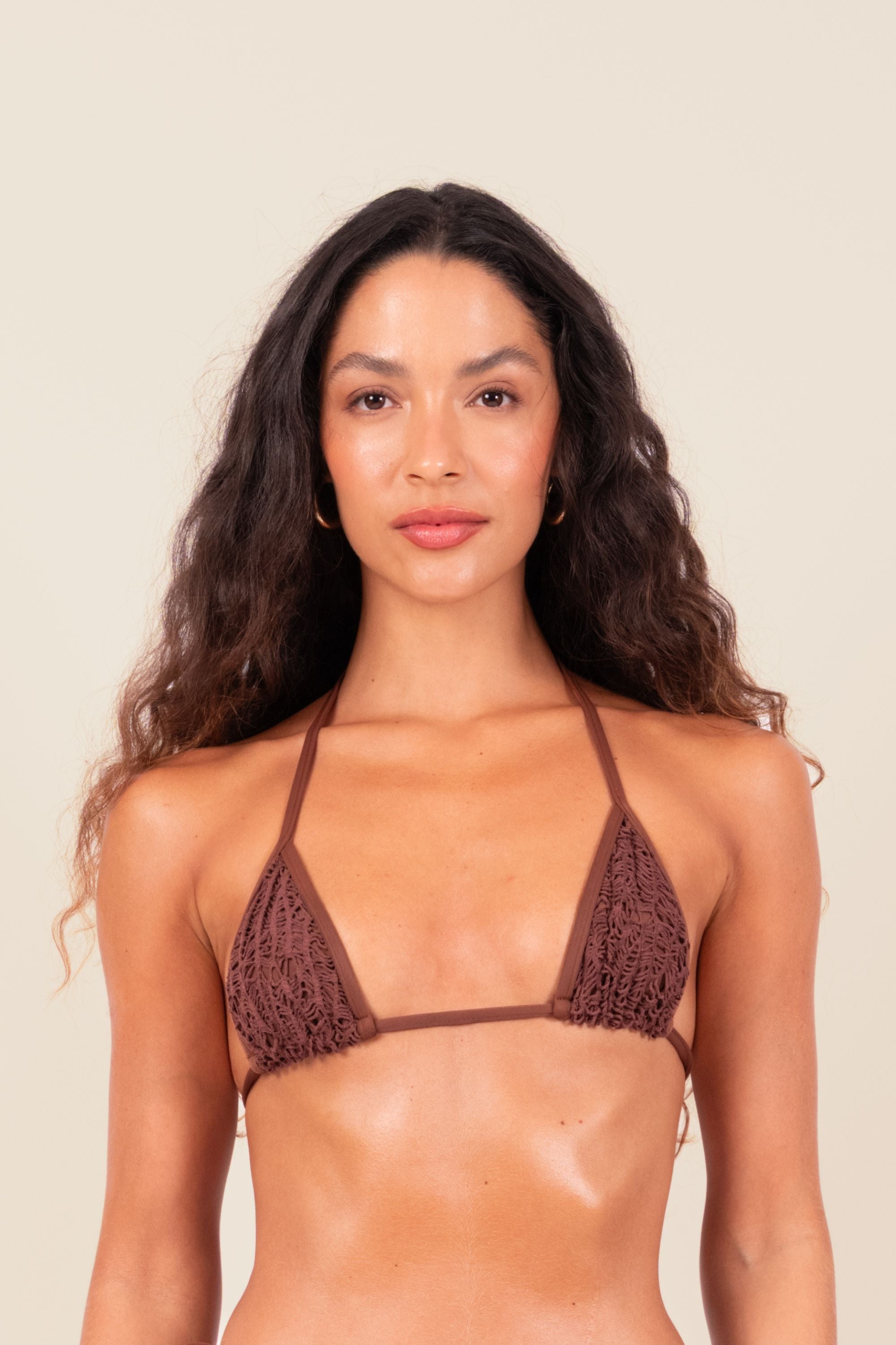 Top em tecido biodegradável Amni Soul Eco® com proteção UV 80. Possui bojo removível e alças soltas, garantindo diversas amarrações.