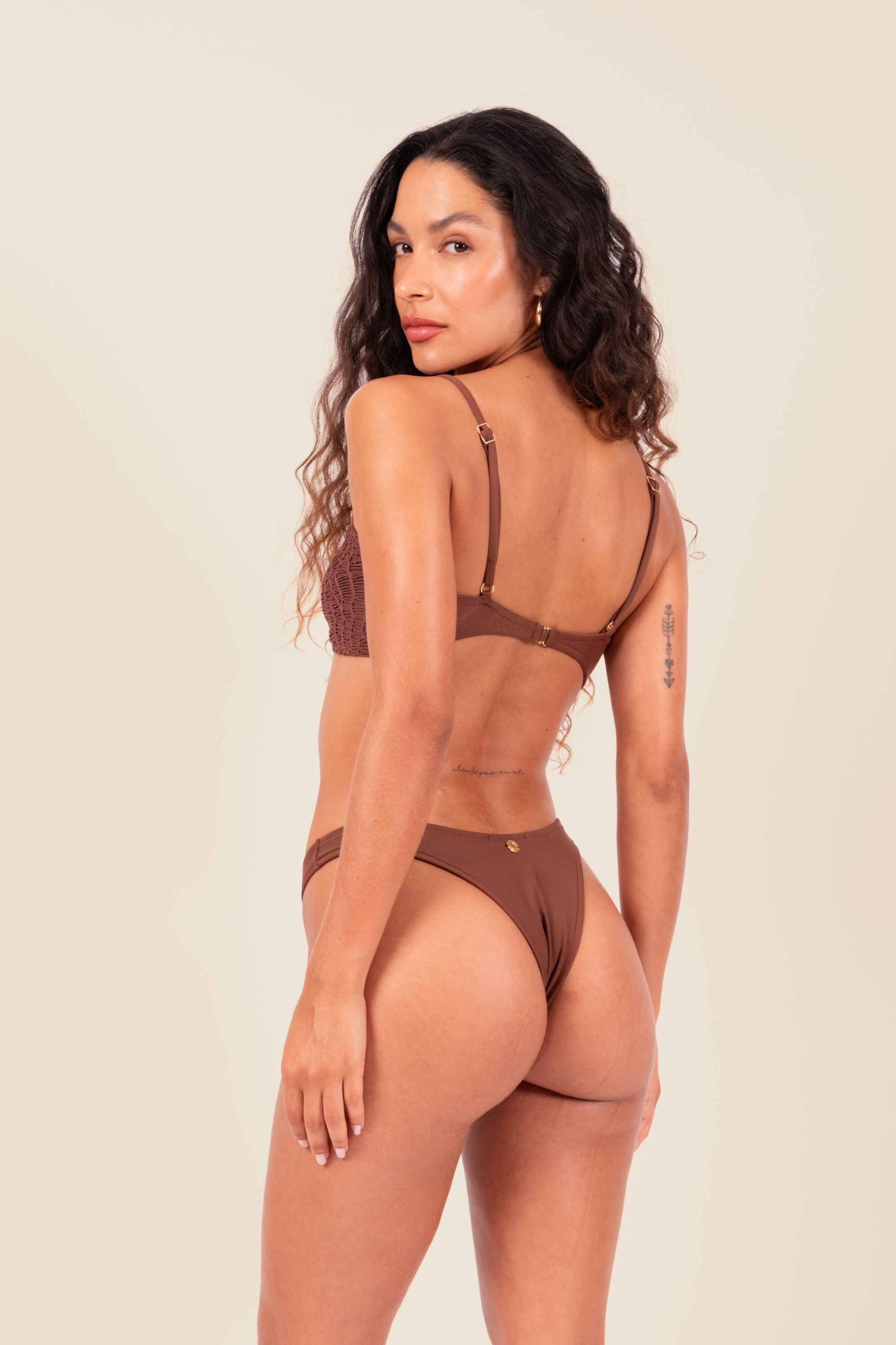 Top em tecido biodegradável Amni Soul Eco® com proteção UV 80. Possui bojo removível e alças soltas, garantindo diversas amarrações.