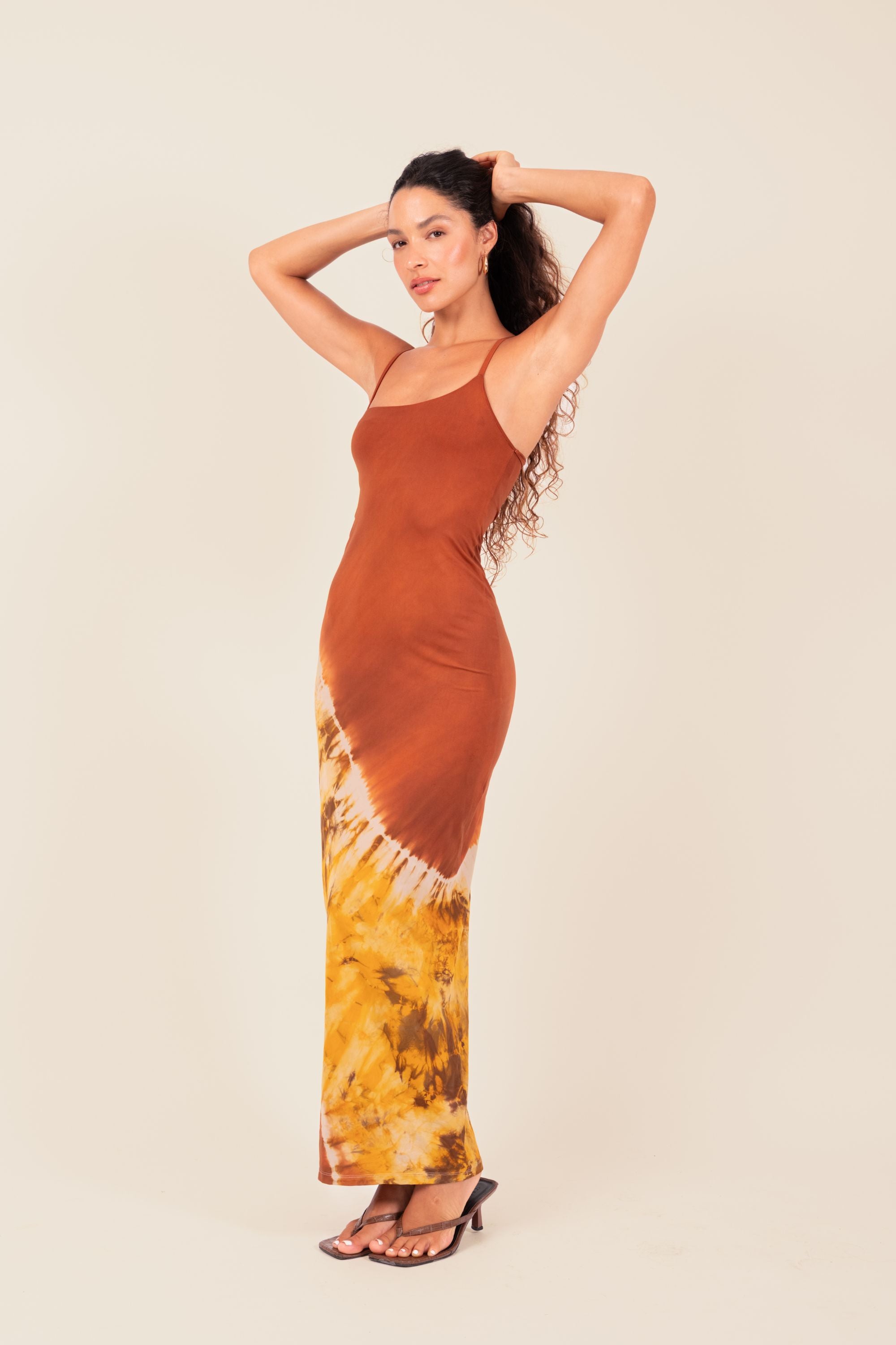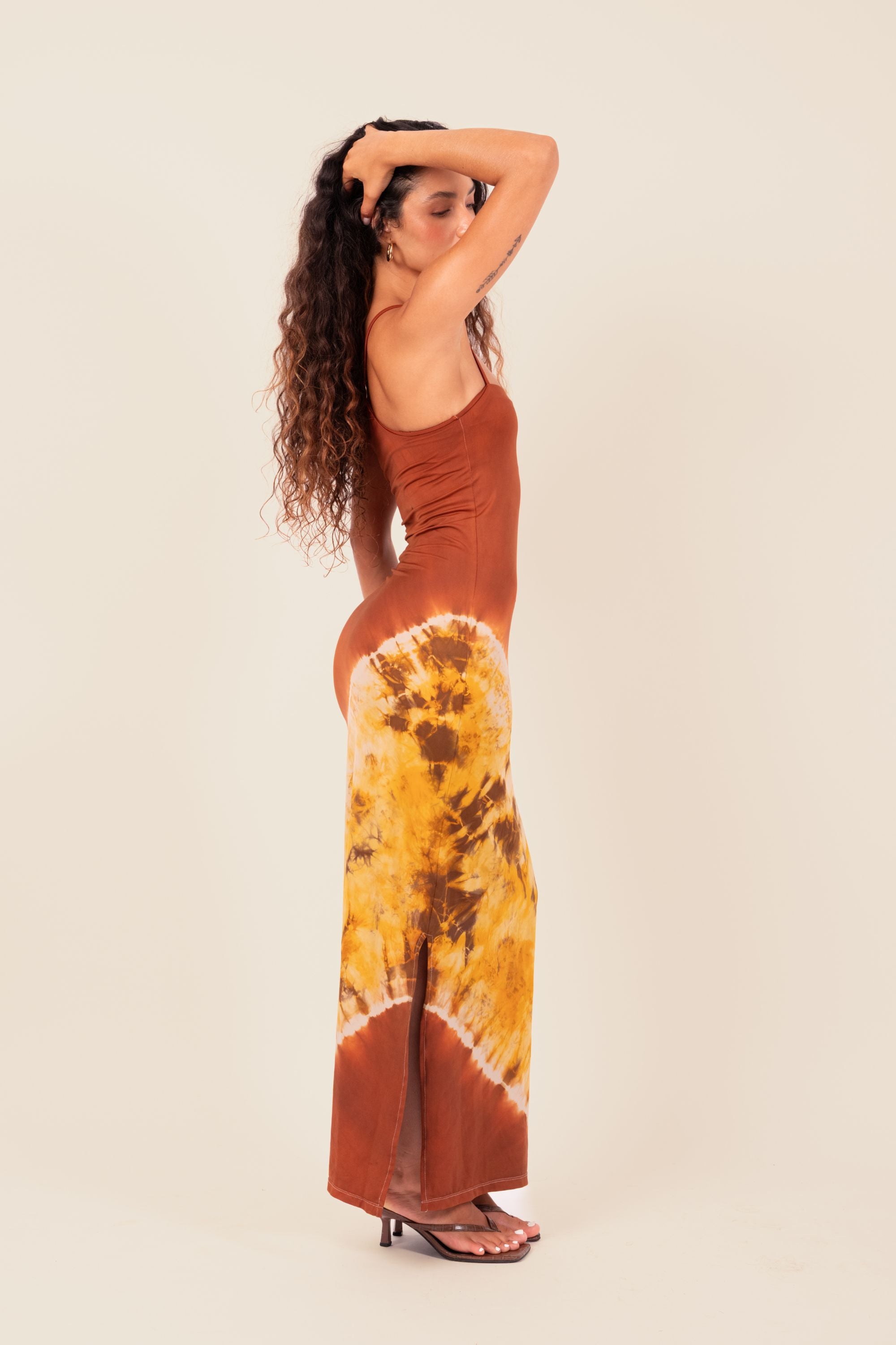 Vestido em tecido biodegradável Amni Soul Eco®, proteção UV 80. Possui comprimento longo com modelagem ajustada ao corpo, decote assimétrico com alças finas e decote costas nadador. Tingimento artesanal.