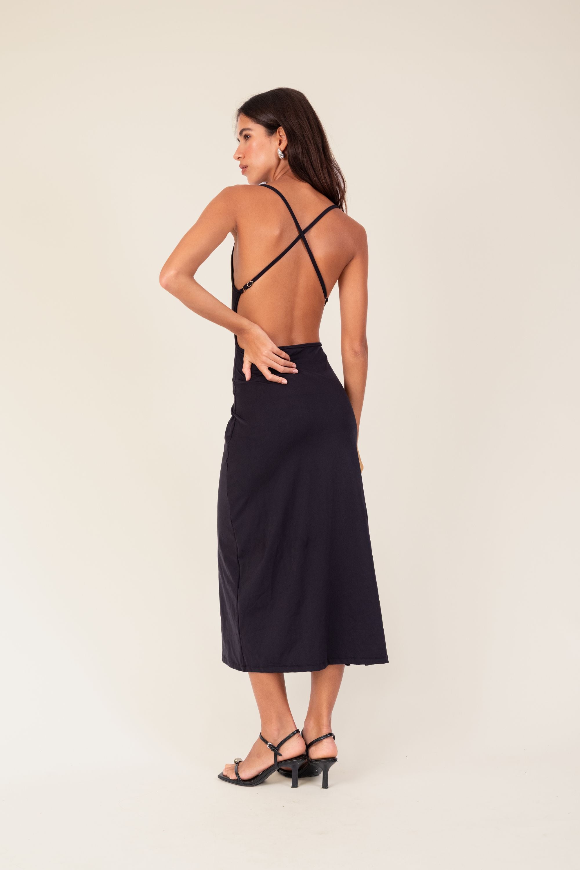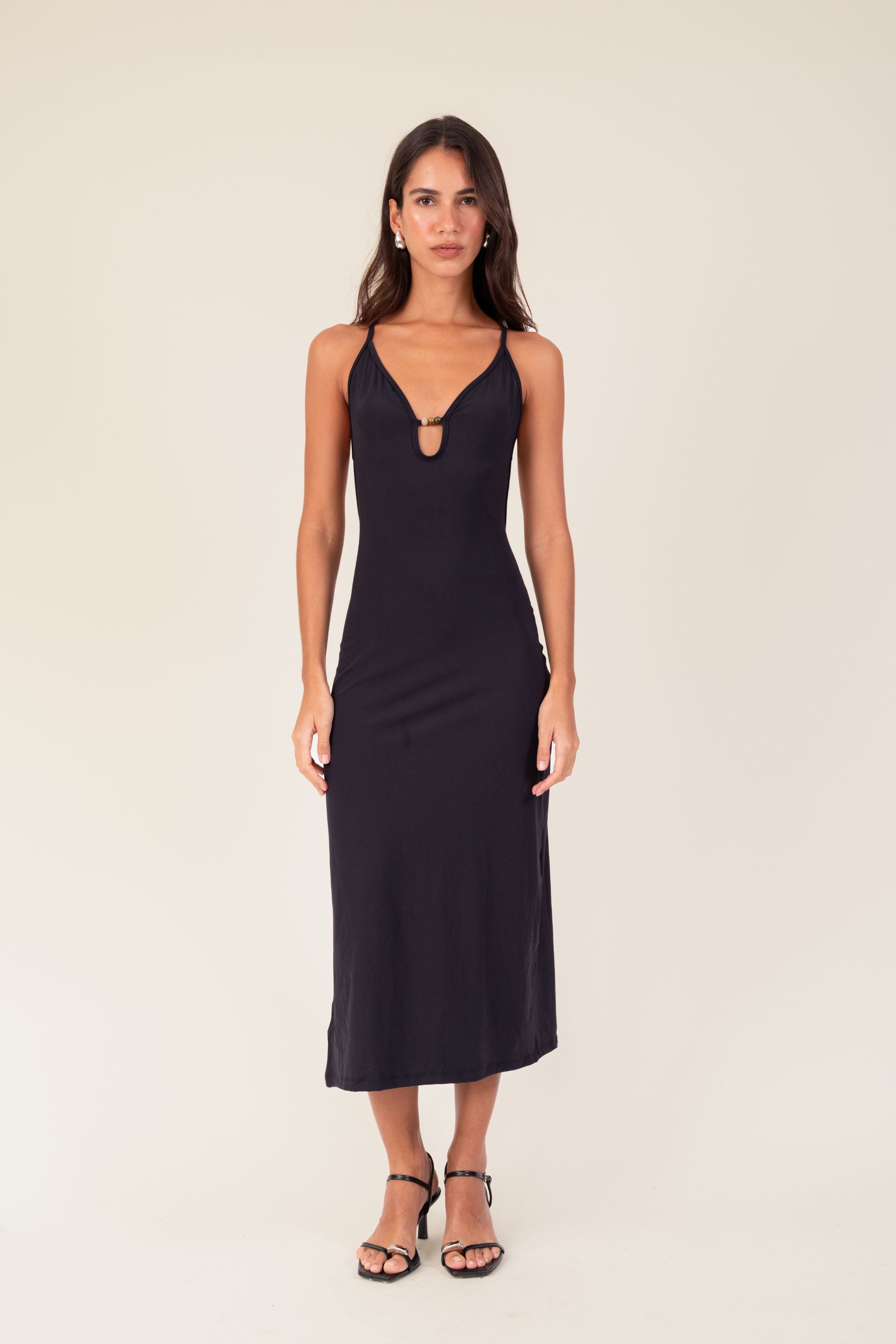 Vestido em tecido biodegradável Amni Soul Eco®, proteção UV 80. Possui comprimento midi/longo, modelagem ajustada, decote com recorte e detalhe em missangas. Decote costas super cavado com alças em X e reguladores.